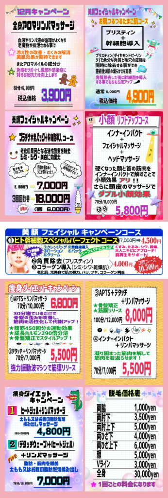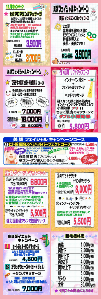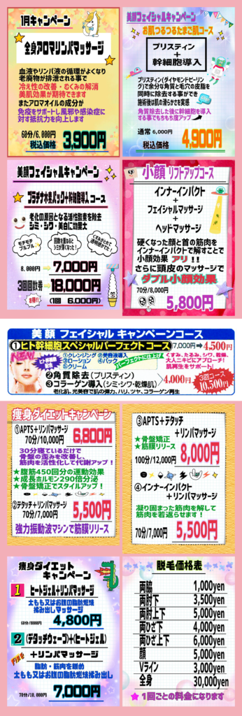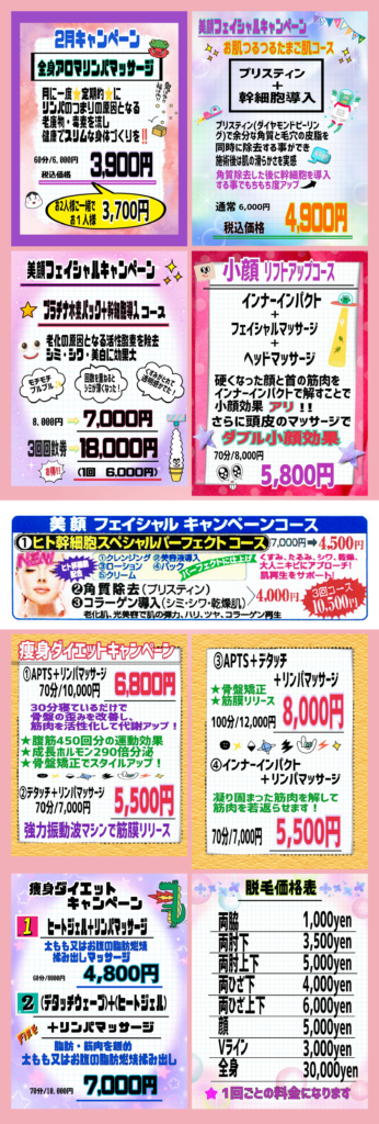 お客様一人ひとりのお肌やお身体の状態、お悩み、ご希望に合わせたアロマリンパマッサージ・体質改善・フェイシャル・痩身脱毛など多種多様なオリジナルメニューを展開しています。100%天然成分の「精油」×極上手技×最新設備で、表面的な美しさだけでなく、内面から心身の調子を整えることで本来の美しさを取り戻すお手伝いをいたします。
